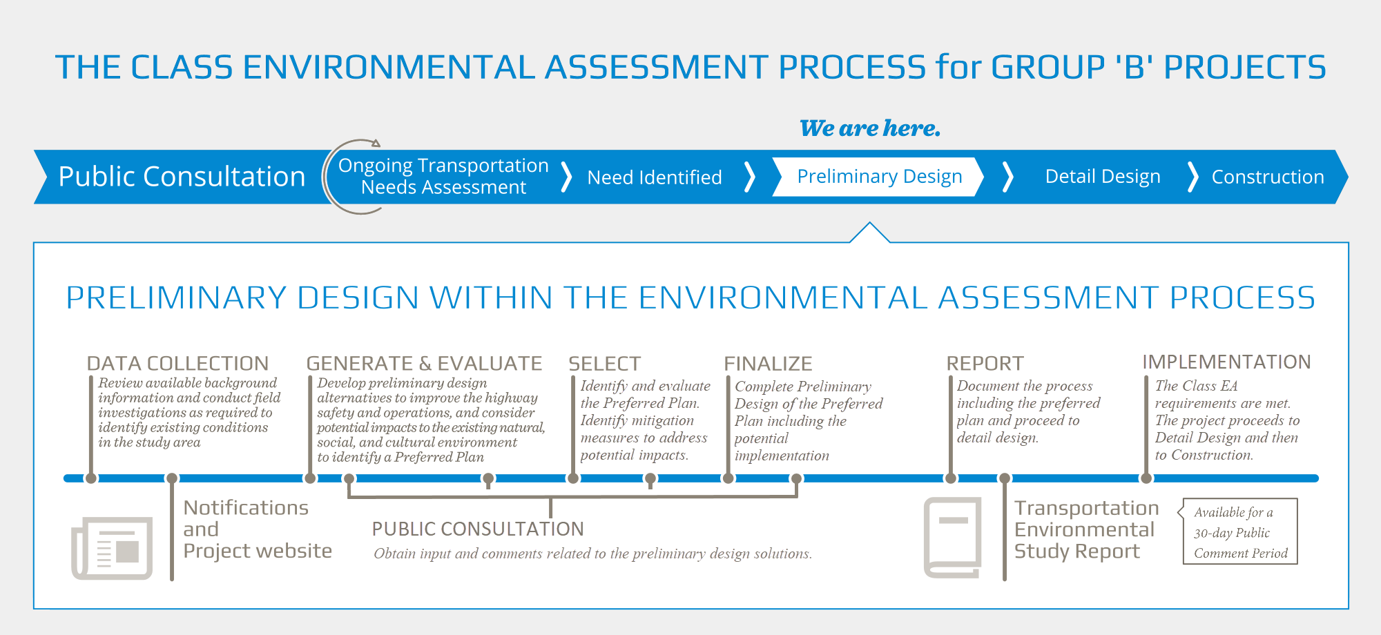 The Class Environmental Assessment (EA) for Provincial Transportation Facilities and Municipal Expressways (2024) provides a decision-making process to make sure that all relevant engineering and environmental factors are considered in the planning and design of transportation facilities. This Preliminary Design and Class Environmental Assessment Study is being undertaken as a Group ‘B’ project, which includes highway improvements that modify traffic access or add capacity to existing provincial transportation facilities.